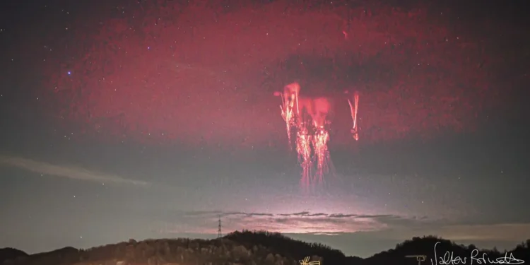 Uma imagem que rapidamente viralizou nas redes sociais mostra um gigantesco anel de luz avermelhado no céu sobre a Itália central, com mais de 200 quilômetros de diâmetro e longos “tentáculos” entrelaçados. A cena, que à primeira vista poderia lembrar um filme de ficção científica, é na verdade o registo raro de uma dupla de fenômenos luminosos atmosféricos — um elves acompanhando sprites — gerados por um potente relâmpago ocorrido no Mar Adriático em 26 de novembro de 2025.