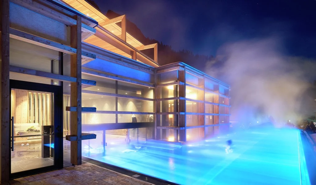 A hospedagem costuma incluir café da manhã completo, com produtos selecionados, e acesso ao amplo centro wellness, que soma mais de 3.100 m² entre áreas internas e externas. Piscinas, saunas, áreas de relaxamento e tratamentos completam a proposta de bem-estar, sempre com vista para as montanhas.