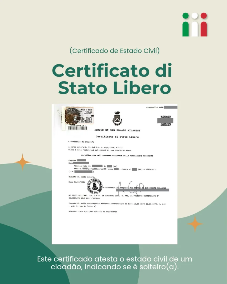 O documento é retirado diretamente do arquivo dell’anagrafe do comune e é frequentemente solicitado para procedimentos administrativos, processos de casamento ou trâmites legais que exigem a comprovação do estado civil.
