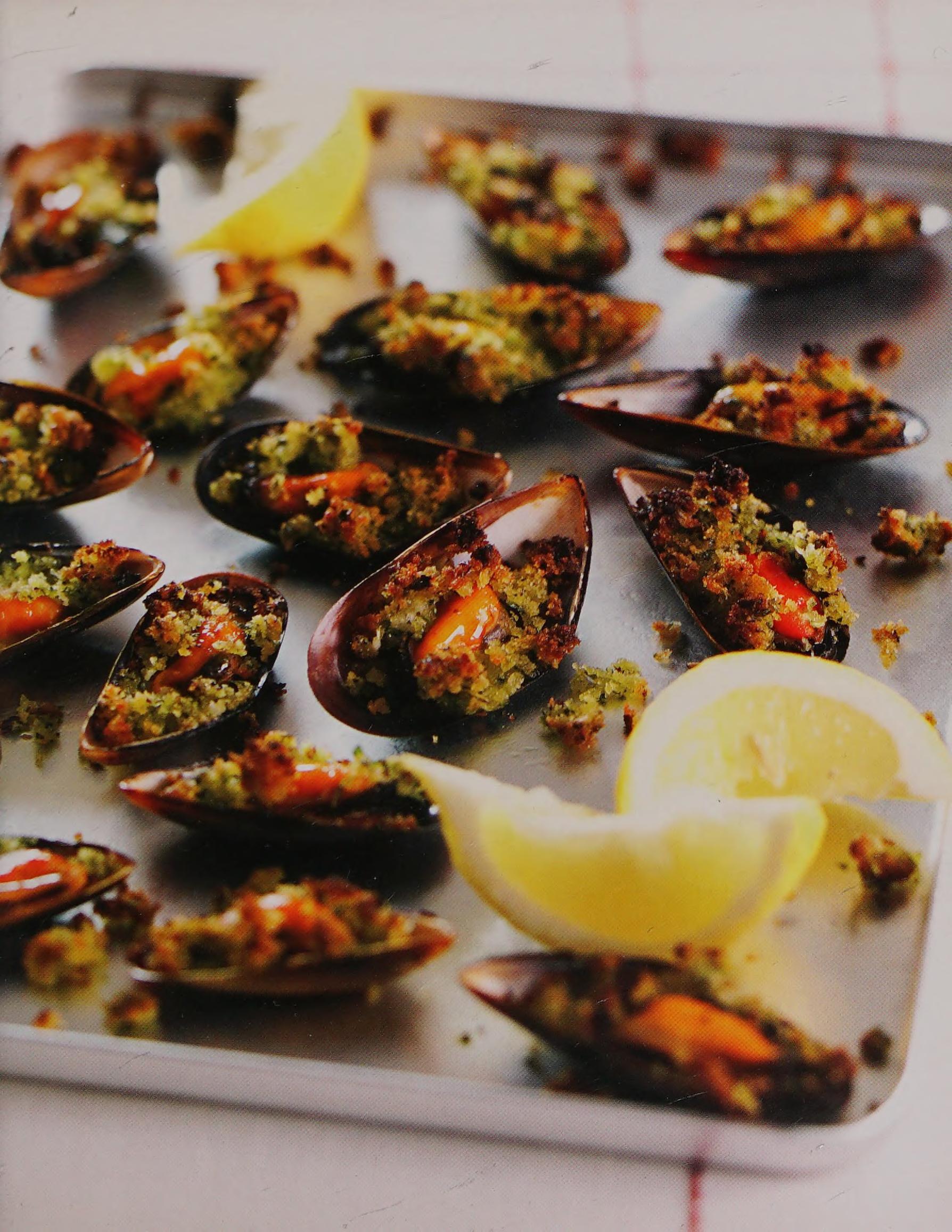 Disponha numa assadeira. Distribua a farofa reservada por cima e cozinhe na grade superior do forno preaquecido por 1-2 minutos, até ficar dourada. Sirva imediatamente com gomos de limão-siciliano ou limão comum ao lado.