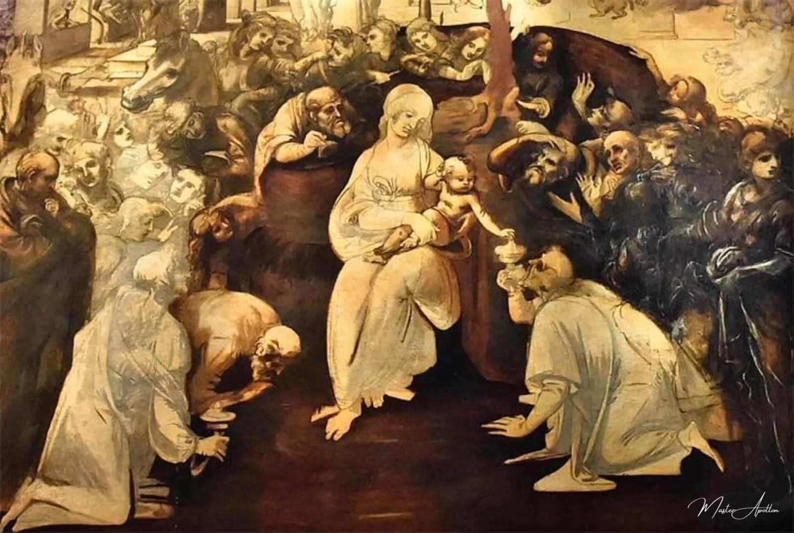 Esta obra inacabada encontra-se também na Galleria degli Uffizi e mostra o momento em que os Reis Magos visitam o menino Jesus. Leonardo abandonou o projeto quando se mudou para Milão. Mesmo incompleta, a pintura revela a genialidade de sua composição dinâmica e o uso inovador de luz e sombra.