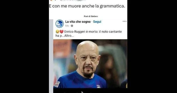 Circulou nas redes sociais uma notícia alarmante anunciando a morte do Enrico Ruggeri, mas tratava-se de uma fake news — e não foi apenas o conteúdo que chamou atenção: havia também um erro de ortografia grosseiro na publicação que denunciava a falsidade do caso quase por si só. A peça viral, publicada em uma página no Facebook, trazia a legenda “Non c’è l’ha fatta” ao lado de uma foto do artista, frase que já denunciava o deslize linguístico.