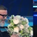 O coapresentador Achille Lauro vestiu um smoking total white da casa Dolce&Gabbana, com um colete escultórico e um laço expressivo. O toque final: diamantes e rubis ao pescoço, um detalhe de joalheria que o reafirma como performer-icone — a imagem do artista como obra de arte ambulante.