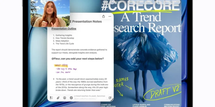 O dispositivo mantém o posicionamento comercial anterior, com os preços de partida inalterados para os modelos de 11 e 13 polegadas. Há compatibilidade com acessórios de ponta, incluindo a Apple Pencil Pro e a Magic Keyboard com trackpad. A câmera frontal de 12 MP com enquadramento automático Center Stage foi reposicionada para o lado longo do aparelho, favorecendo videochamadas em orientação horizontal — um ajuste prático que reflete a prevalência do uso em modo paisagem para colaborações e apresentações.