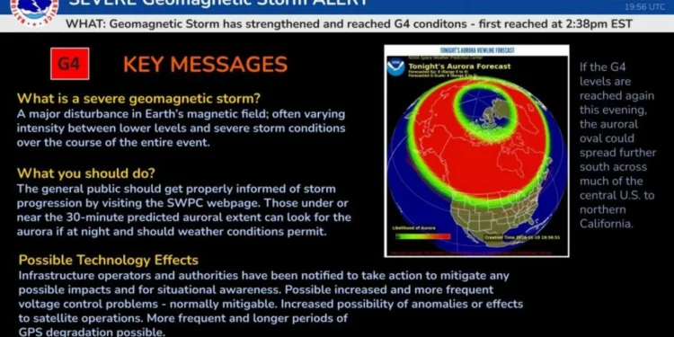 Por Riccardo Neri — Uma forte tempestade solar começou a afetar a Terra nas últimas horas e representa risco de interrupções em sistemas críticos, incluindo satélites, comunicações em alta frequência e a rede elétrica. A avaliação foi feita por Shawn Dahl, do U.S. Space Weather Prediction Center (SWPC), que classificou o evento como uma tempestade geomagnética de nível 4 em uma escala de 1 a 5.