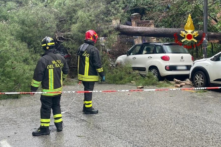 Em Ancona, no centro da cidade, os Vigili del Fuoco atuaram após a queda de um grande pinheiro que atingiu um muro de contenção e dois veículos em trânsito. O incidente ocorreu durante uma forte chuva e deixou a via parcialmente bloqueada enquanto equipes de emergência removiam os destroços e avaliavam os danos ao pavimento e às estruturas adjacentes.