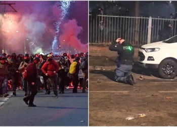 O episódio deixou 11 pessoas feridas no sábado à tarde, durante os confrontos que eclodiram no cortejo em defesa do centro social Askatasuna. Entre os feridos está um policial que, conforme mostram as imagens, foi cercado e agredido por um grupo de manifestantes mesmo após ter sido derrubado ao chão. A intervenção de um colega foi considerada providencial: ele conseguiu afastar o agressor e possibilitar o atendimento médico.