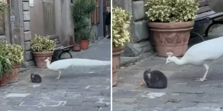 Um vídeo amplamente difundido nas redes sociais, publicado pela página Sportello a 4 zampe – Provincia di Perugia, mostra o pavão em interação próxima com um filhote de gato enquanto compartilha a refeição oferecida por moradores. Nas imagens, o comportamento do ave é cauteloso, mas assertivo: aproxima-se dos outros animais para reivindicar sua parte do alimento e, como gesto de agradecimento, frequentemente exibe a cauda em leque, a chamada “ruota”.