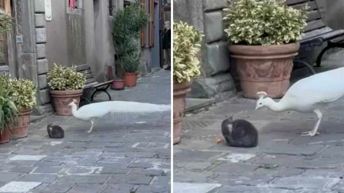 Um vídeo amplamente difundido nas redes sociais, publicado pela página Sportello a 4 zampe – Provincia di Perugia, mostra o pavão em interação próxima com um filhote de gato enquanto compartilha a refeição oferecida por moradores. Nas imagens, o comportamento do ave é cauteloso, mas assertivo: aproxima-se dos outros animais para reivindicar sua parte do alimento e, como gesto de agradecimento, frequentemente exibe a cauda em leque, a chamada “ruota”.