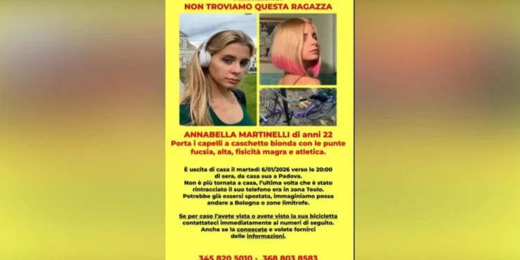 Quinto dia de operações de procura por Annabella Martinelli, 22 anos, residente em Teolo (província de Pádua). A estudante de Direito da Universidade de Bolonha está desaparecida desde a noite de terça-feira, 6 de janeiro de 2026. Segundo a apuração, ela saiu de casa por volta das 20h em sua bicicleta — descrita em apelos como rosa — e não retornou.