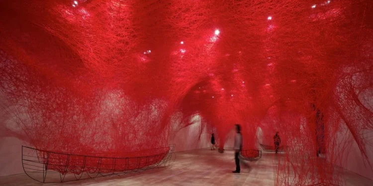Não se esquece facilmente do grande entrelaçado que se estendia por um pavilhão inteiro: dois barcos de madeira, moldados como mãos que formam uma taça, acolhiam mais de 50 mil chaves doadas por pessoas do mundo inteiro. As chaves, suspensas no abraço dos fios vermelhos, tornavam visíveis histórias anônimas — pequenas geografias de lembrança e desejo.