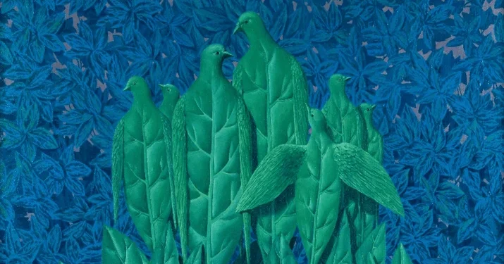 Ao contrário de versões anteriores do mesmo tema, nesta composição os pássaros-folha emergem diante de um compacto conjunto de folhagens azuis, um plano que cria uma sensação de suspensão — quase cinematográfica — onde a narrativa visual se fragmenta. Em primeiro plano, um único pássaro abre as asas, e a pergunta permanece: irá alçar voo ou continuar preso ao chão? É essa ambiguidade, esse reframe da realidade, que faz da pintura não apenas um objeto de mercado, mas um roteiro oculto da sociedade sobre desejo e limitação.