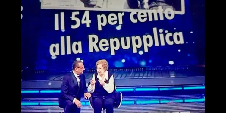 No palco do Festival, onde a música costuma funcionar como um espelho do nosso tempo, a noite ganhou uma pausa entre história e erro. Durante uma entrevista emocionada com Gianna Pratesi, de 105 anos, a produção exibiu atrás da centenária uma grafia equivocada: no telão apareceu “Il 54 per cento alla Repupplica” — a primeira gaffe desta edição.