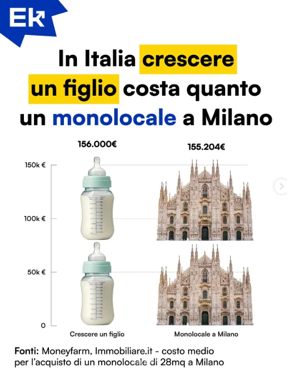 Criar um filho na Itália até os 18 anos custa, em média, cerca de 156 mil euros, um valor próximo ao preço de um estúdio de 28 metros quadrados em Milão. Considerando o preço médio por metro quadrado na cidade, de 5.543 euros (dados do Immobiliare.it), o total chega a aproximadamente 155.204 euros, comparando o esforço financeiro das famílias ao custo de um imóvel urbano.