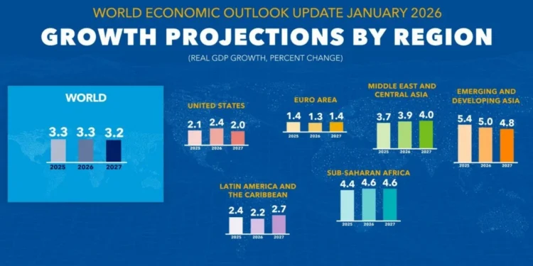 O motor da economia global mostrou capacidade de resiliência mesmo num ano marcado pelo retorno de Donald Trump à Casa Branca e por um aumento sem precedentes do nível médio das tarifas. No World Economic Outlook de janeiro, o FMI revisou para cima a previsão de crescimento global em 2026, para 3,3% — duas décimas a mais do que a estimativa de outubro — e projeta uma desaceleração apenas marginal para 3,2% em 2027.