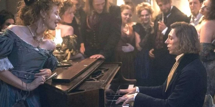 Entre as paixões e fugas amorosas, o longa aborda relações íntimas do compositor, inclusive a célebre ligação com George Sand. O filme escolhe um ponto de vista provocador: a impossibilidade de Chopin de se vincular emocionalmente às pessoas na mesma medida em que se doava à sua música. «Ele amava a música; era sua bênção e sua maldição», sugere a leitura da produção. Ser um gênio — e aqui a afirmação ecoa como um refrão doloroso — significa estar apartado, sentir com outra escala e pagar um preço afetivo.