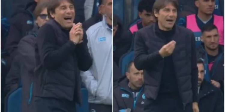 Dois lances concentram o descontentamento napolitano. Aos 42 minutos do primeiro tempo, após consultar o monitor do VAR, o árbitro Chiffi voltou atrás e revogou um pênalti inicialmente assinalado ao Napoli pelo contato entre Hien e Hojlund. A imagem alterou a decisão inicial: Chiffi entendeu que o atacante dinamarquês foi quem avançou sobre a perna do defensor, tornando o contato insuficiente para manter a marcação da penalidade. A devolução do lance ao jogo foi recebida com incredulidade pela equipe visitante — e provocou a reação visível de Conte, que exclamou, em clara contrariedade, a frase já viralizada nas imagens da transmissão.