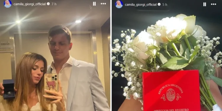 As fotos também mostram um detalhe burocrático que sugere ter ocorrido um registro formal no país sul-americano: um livro vermelho com a inscrição “Dirección del Registro Civil del Estado Civil y Capacidad de las Personas”. A presença desse documento, aliada ao cenário e ao histórico de residência de Giorgi em Buenos Aires, indica que a celebração teve caráter legal e local.