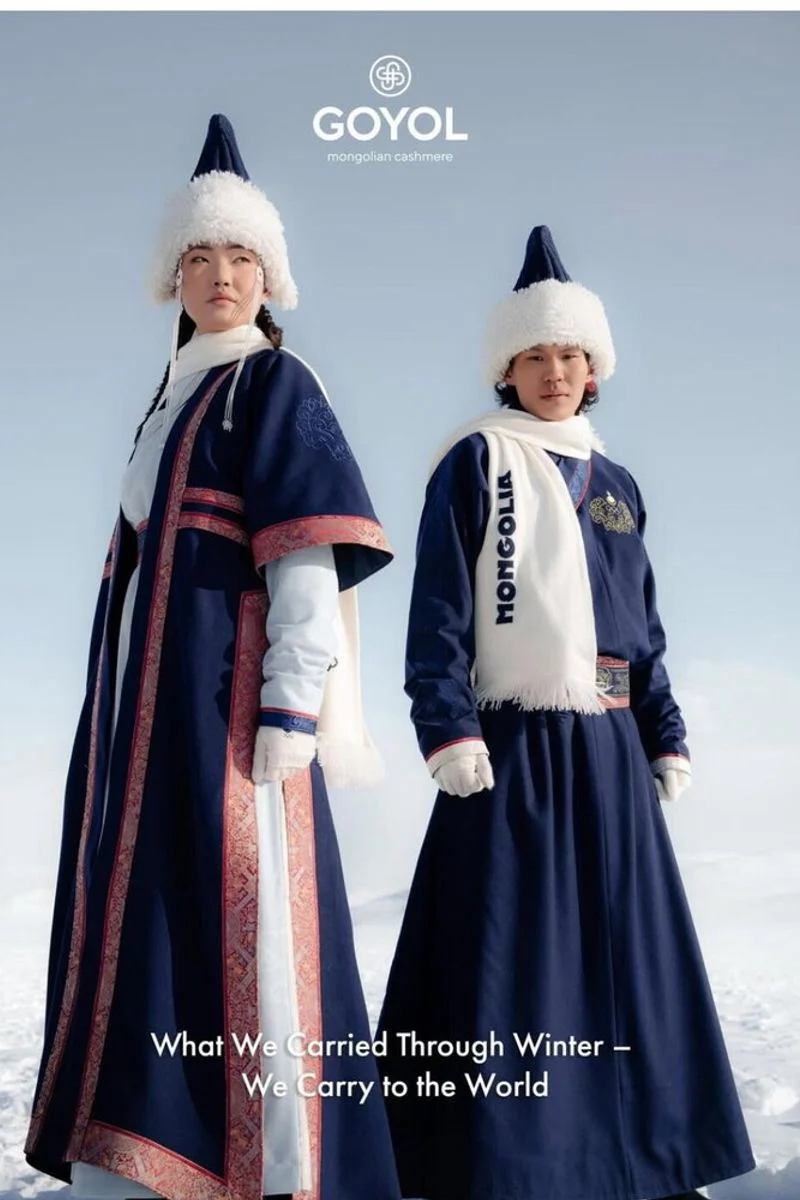 Quem tem ganhado destaque nas redes sociais é Goyol Cashmere. As designers Michel & Amazonka reinterpretaram o deel mongol em chave contemporânea, usando cashmere e seda de elevado padrão artesanal. O resultado é menos vestimenta esportiva e mais objeto de artesanato — uma lembrança de que as roupas olímpicas também são veículos de memória cultural.