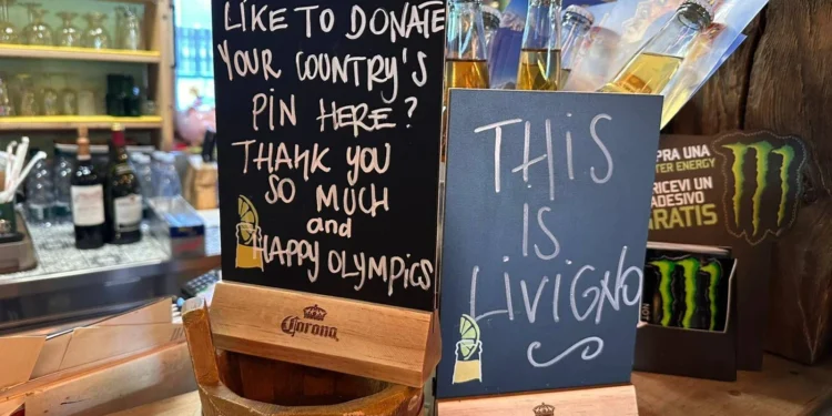 O que chama a atenção neste ciclo é como a economia dos pins se estende para além dos espaços oficiais. Em Valtellina, bares e restaurantes adaptaram o costume local de deixar dinheiro para gorjetas: substituíram os cofrinhos por recipientes que pedem objetivamente — “deixem aqui as pins do vosso país”. A solicitação, formal e prática, converte o hábito em ferramenta de coleção e circulação cultural. É uma pequena economia paralela, com regras tácitas, que redesenha o contato entre visitante e comunidade.