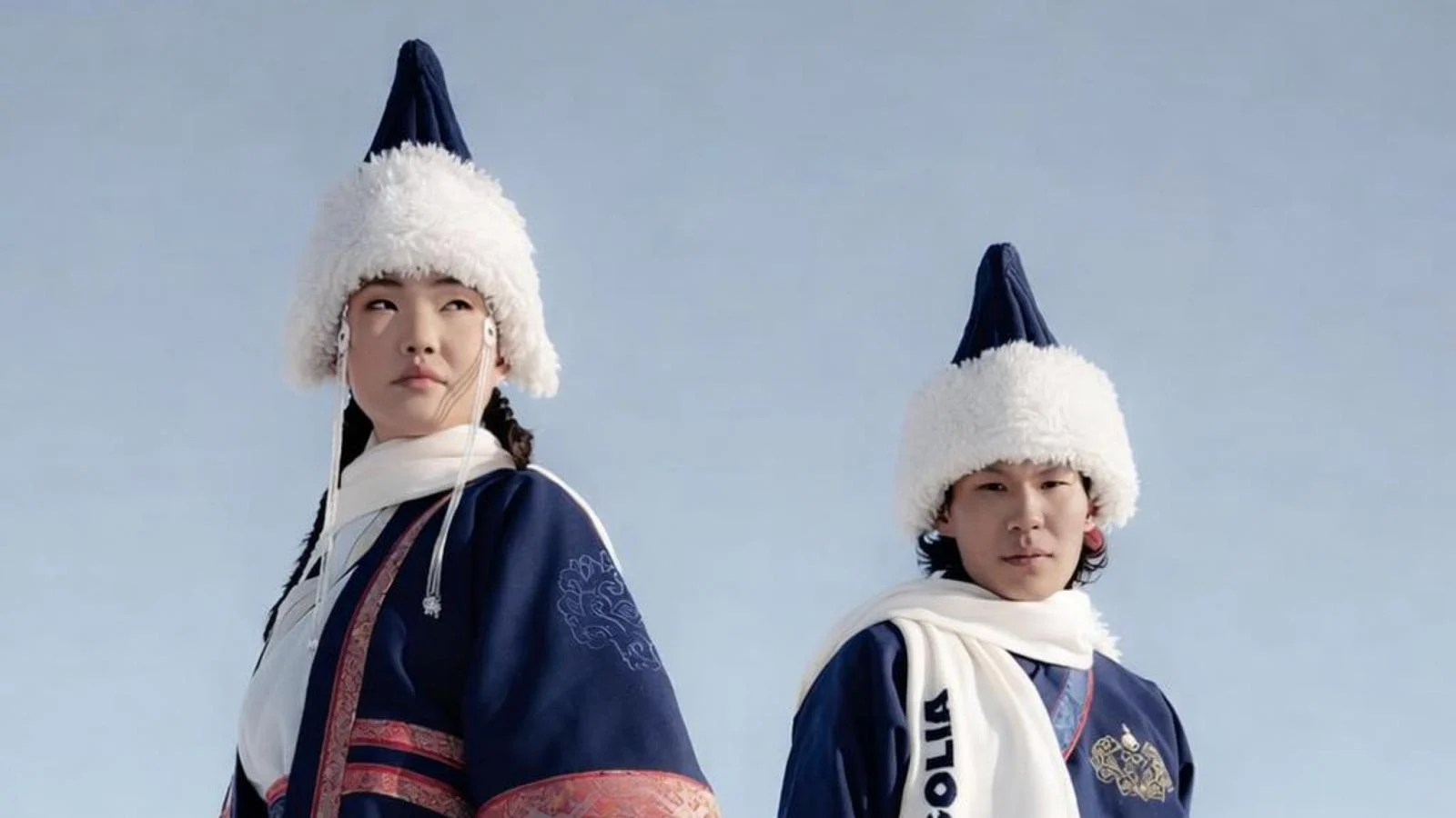 O vídeo de apresentação do time da Mongólia é exemplar na forma como traduz tradição em espetáculo. Nele, uma jovem em azul permanece imóvel na neve, com o olhar firme direcionado à câmera; ao fundo, uma manada de cavalos brancos galopa em câmera lenta. A montagem alterna rostos marcados pelo frio, gestos que remetem a rituais nómades e closes nos tecidos — o cashmere mongol, as acabamentos em seda, os bordados em dourado. Colarinhos altos, linhas sobrepostas e volumes que envolvem o corpo evocam o traje tradicional, reinterpre­tado em chave contemporânea.