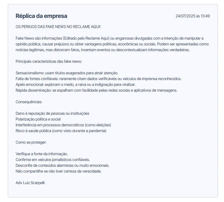 Observa-se que, em algumas das reclamações registradas na plataforma Reclame Aqui, o advogado Luiz Gustavo Scarpelli tem respondido com mensagens genéricas sob o título “Os Perigos das Fake News no Reclame Aqui”. Nesses textos, são abordados conceitos amplos sobre desinformação, suas características e consequências, sem, entretanto, responder de forma direta às situações específicas relatadas pelos reclamantes.