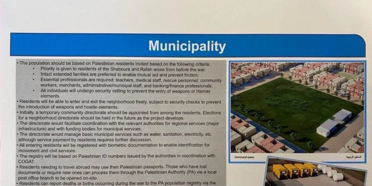 Em termos arquitetônicos e cartográficos, trata-se de um redesenho de espaço habitado com controles rigidamente definidos: uma área residencial fechada, com pontos de passagem controlados por checkpoints, rígidos mecanismos de verificação de segurança e registro biométrico sistemático. Os residentes seriam submetidos a coleta de dados biométricos e teriam acesso a serviços essenciais condicionados a esse controle — além de receberem um instrumento econômico digital referido no documento como um “carteira eletrônica” operando em shekels.