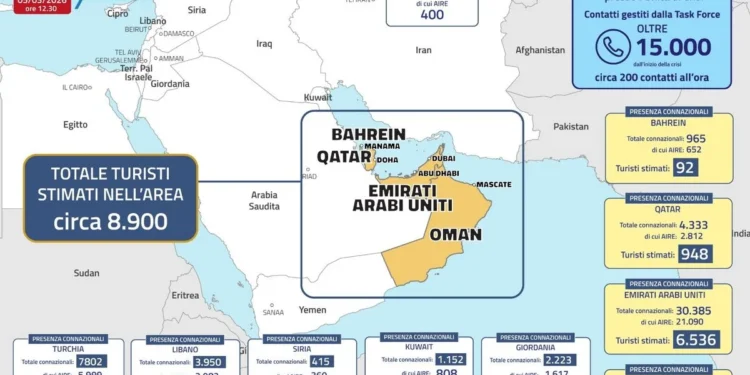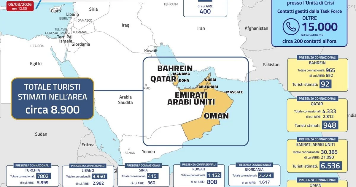 Marco Severini para Espresso Italia — Em um quadro que exige prudência e gestão de crise, a Farnesina atualizou o número de cidadãos italianos ainda presentes na região do Médio Oriente: aproximadamente 8.900 turistas e residentes. A distribuição informada pelo ministério mostra 92 no Bahrein, 948 no Qatar, 6.536 nos Emirados Árabes Unidos e 1.386 em Omã.