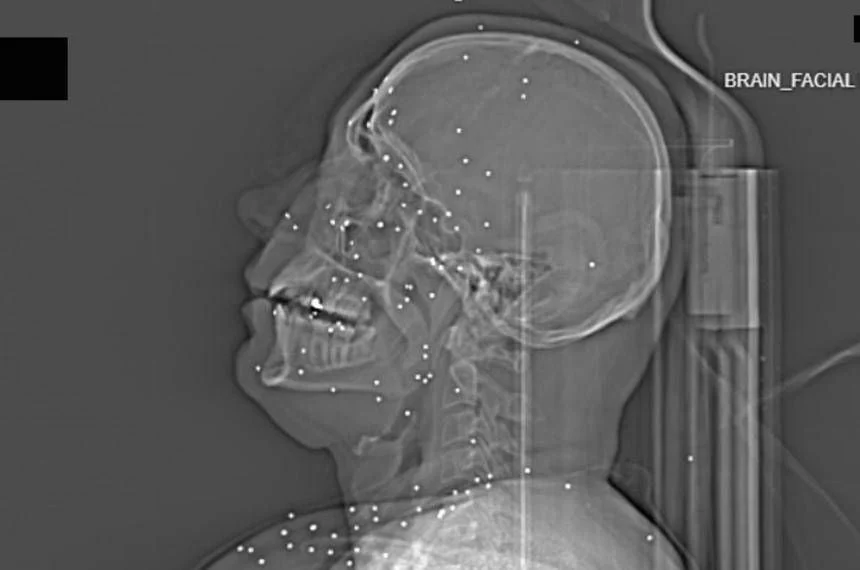 Entre os casos analisados há o de “Anahita” (nome fictício), uma jovem pouco mais que vingtenária. Suas imagens mostram múltiplas pequenas esferas metálicas, de 2 a 5 mm, dispersas pelo rosto, nas órbitas oculares e até numa área encefálica. São projéteis do tipo birdshot — perdigões de caça — que, disparados a curta distância, não representam ferimentos leves: estilhaçam ossos, destroem tecidos moles e frequentemente resultam na perda ocular. Anahita perdeu ao menos um olho, possivelmente os dois.