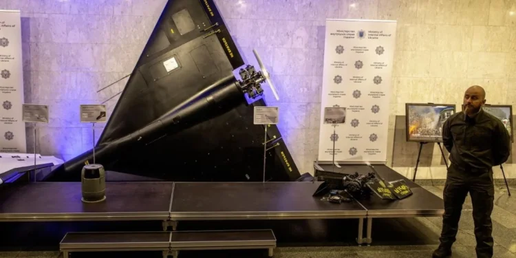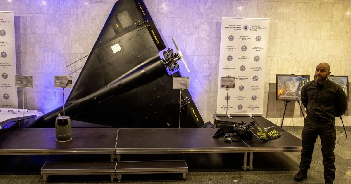 Produzido pela Iran Aircraft Manufacturing Industrial Company (empresa submetida a sanções dos Estados Unidos), o drone Shahed-136 é um loitering munition — conhecido popularmente como drone «kamikaze» — projetado para colidir com o alvo e detonar. Sua arquitetura é simples: 3,5 metros de comprimento, envergadura de 2,5 metros, velocidade máxima em torno de 185 km/h e, segundo o Ministério da Defesa britânico, um alcance declarado de até 2.500 km. A fuselagem em delta carrega uma ogiva de cerca de 36 kg.