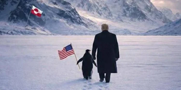 Em mais um lance de exibição midiática, Donald Trump recorreu à inteligência artificial para ilustrar uma narrativa de poder — e a Casa Branca acabou por cometer um erro elementar que virou constrangimento público. A imagem divulgada em perfis oficiais mostra o presidente em solo nevado da Groenlândia, caminhando ao lado de um pinguim que ostenta a bandeira dos Estados Unidos. O objetivo declarado: sinalizar a importância da ilha para a segurança nacional americana e um suposto acordo que concederia “acesso total” ao território.