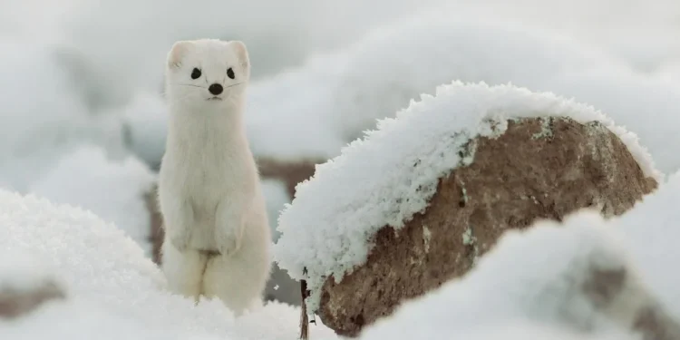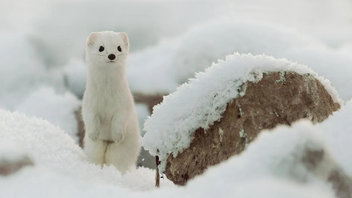 Do outro lado da vitrine olímpica aparece o pequeno ermelino, mascote simbólica dos eventos de inverno. Este mustelídeo muda o manto do castanho avermelhado de verão para um branco quase total no inverno, estratégia de camuflagem que funciona enquanto houver neve. Com as temporadas mais curtas e irregulares, o manto branco pode se tornar um fardo, expondo o animal a predadores e rompendo equilibrios ecológicos.