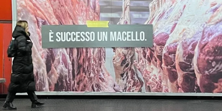 Por Aurora Bellini — Em um gesto que cortou a rotina urbana como um feixe de luz sobre um mapa antigo, grandes manifestos começaram a aparecer em pontos estratégicos de **Milão** e **Roma**: paredes das plataformas de metrô, mezaninos, pontos de ônibus e paradas de tram. As imagens são diretas e perturbadoras — cortes de **carne** e quartos de boi pendurados em câmaras frigoríficas — acompanhadas por slogans secos como «È successo un macello» e «Nessuno nasce vegano».