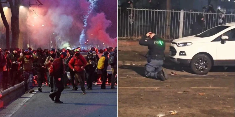 O documento que comunicou a data da audiência foi assinado em 2 de fevereiro — dois dias após os confrontos que marcaram a manifestação Pro Askatasuna no centro piemontês. Aquela noite teve a dimensão de uma guerrilha urbana: homens encapuzados, com roupas escuras, capacetes e passam-montanhas atacaram repetidas vezes os contingentes das forças da ordem, lançando pedras, garrafas de vidro, rojões e bombas de efeito sonoro; ergueram barricadas com contentores incendiados e chegaram a atear fogo a uma caminhoneta da polícia.