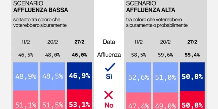 No cenário que considera apenas os eleitores que afirmam que vão com certeza votar — uma estimativa de affluenza em 46% — o No alcança 53,1% das intenções de voto. Já no cenário mais amplo, com participação estimada em 55,4% (inclui também quem declara que provavelmente irá às urnas), o quadro se nivela: Sì e No aparecem empatados, cada um com 50%.