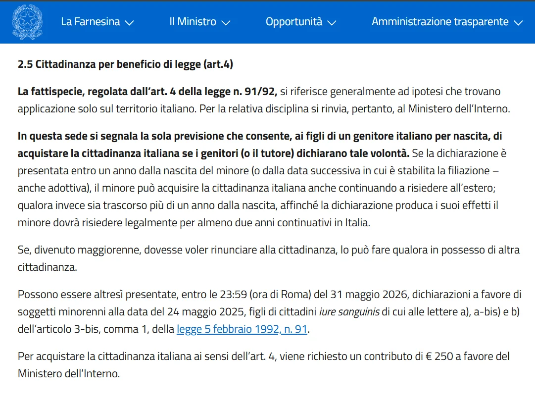 Uma atualização legislativa ampliou o prazo para apresentação das declarações: elas podem ser protocoladas até 23h59 (hora de Roma) do dia 31 de maio de 2026, em favor de menores que, em 24 de maio de 2025, sejam filhos de cidadãos italianos reconhecidos por direito de sangue conforme previsto no artigo 3-bis da Lei nº 91/1992.