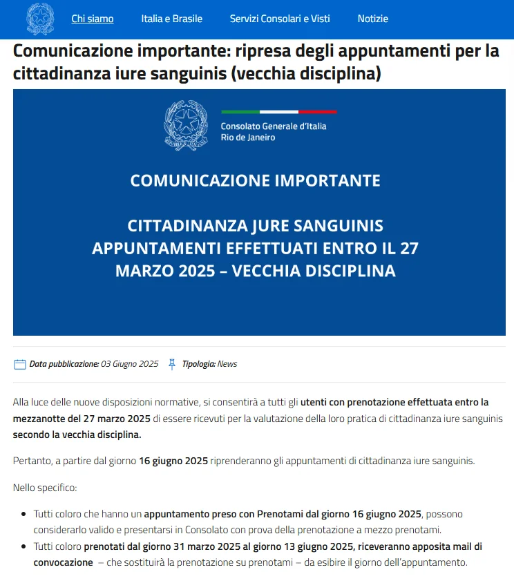 Consulado Italiano no Rio de Janeiro publica novas diretrizes para agendamentos de cidadania jure sanguinis com base em mudanças legais e datas.