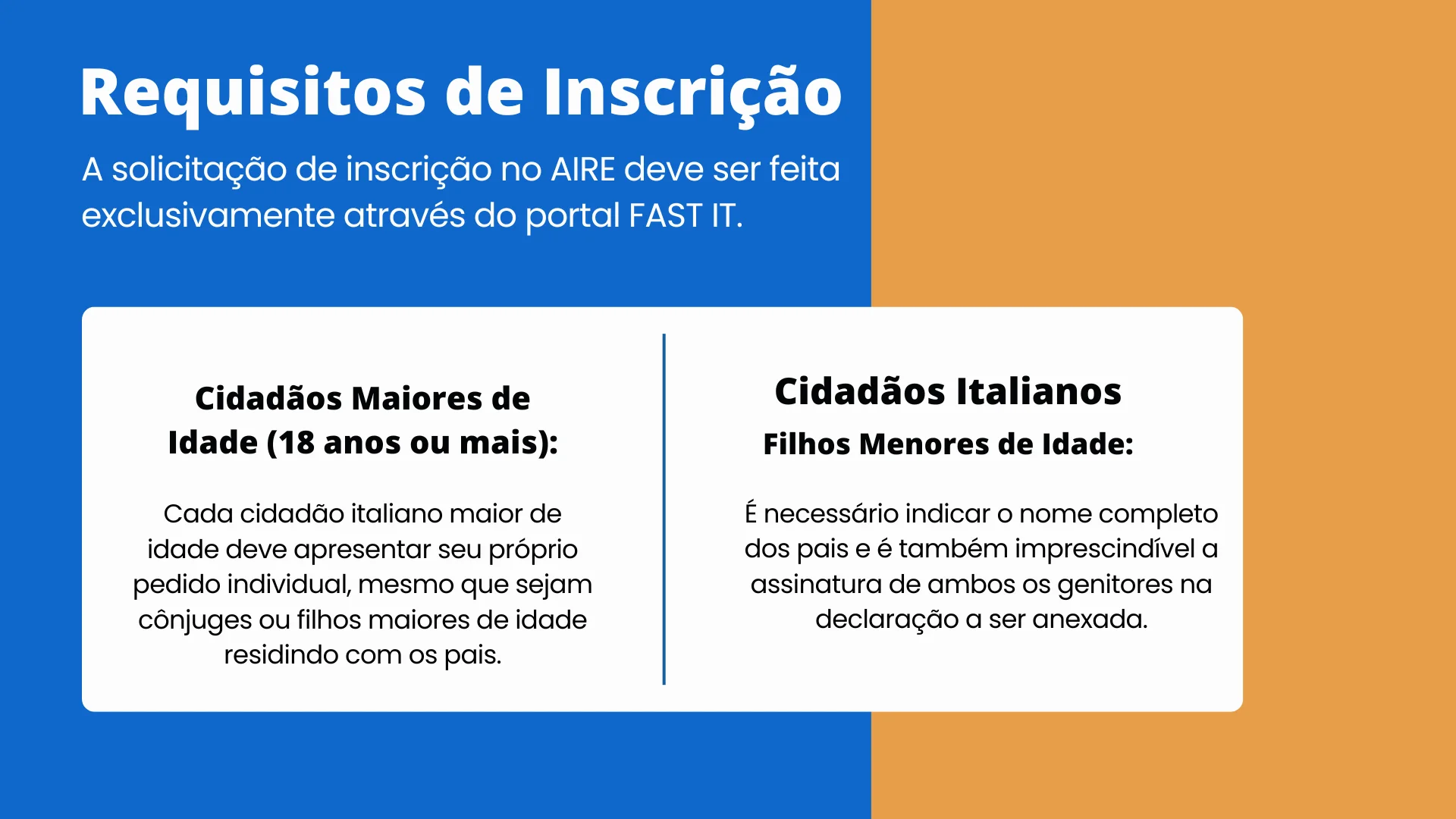 O Registro no AIRE é obrigatório para cidadãos italianos que transferem sua residência habitual para o exterior por um período superior a 12 meses. Além disso, também se aplica a cidadãos italianos que já residem permanentemente no exterior, seja por nascimento ou por aquisição posterior da cidadania italiana.