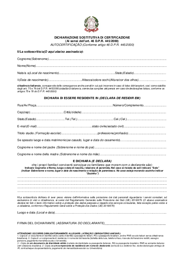 - Descrição: Caso você nunca tenha residido na Itália, o município de referência será aquele onde sua certidão de nascimento foi transcrita.