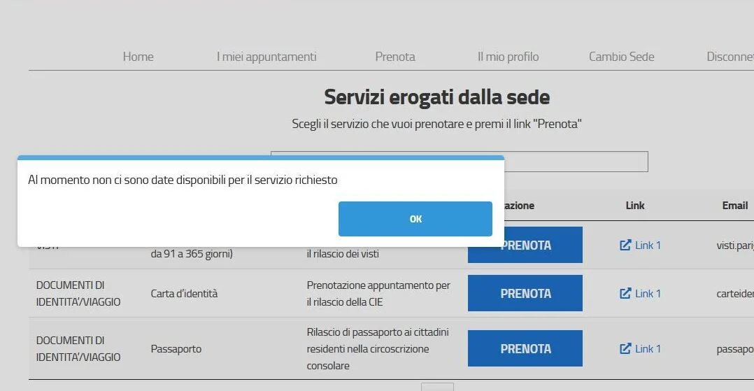 Caso não existam vagas disponíveis para um determinado serviço consular, o sistema apresenta ao utilizador a mensagem “Atualmente não existem datas disponíveis para o serviço solicitado” ou em qualquer caso todas as datas do calendário desse serviço estarão destacadas a vermelho . Como a cada 24 horas, o sistema abre um dia de novos agendamentos, é aconselhável tentar efetuar novamente a reserva no dia seguinte. Consulte mais sobre os horários de agendamentos para emissão do passaporte italiano ou vaga de cidadania.