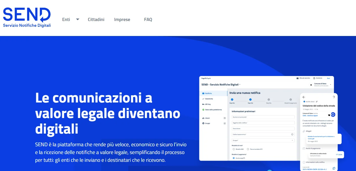 Para acessar o SEND e ler as notificações que você recebe como cidadão acesse Citizens.notifichedigitali.it . Se você é o Representante Legal de uma empresa ou tem permissão para ler suas notificações, acesse impresa.notifichedigitali.it . Em ambos os casos, você precisará inserir suas credenciais SPID ou CIE.