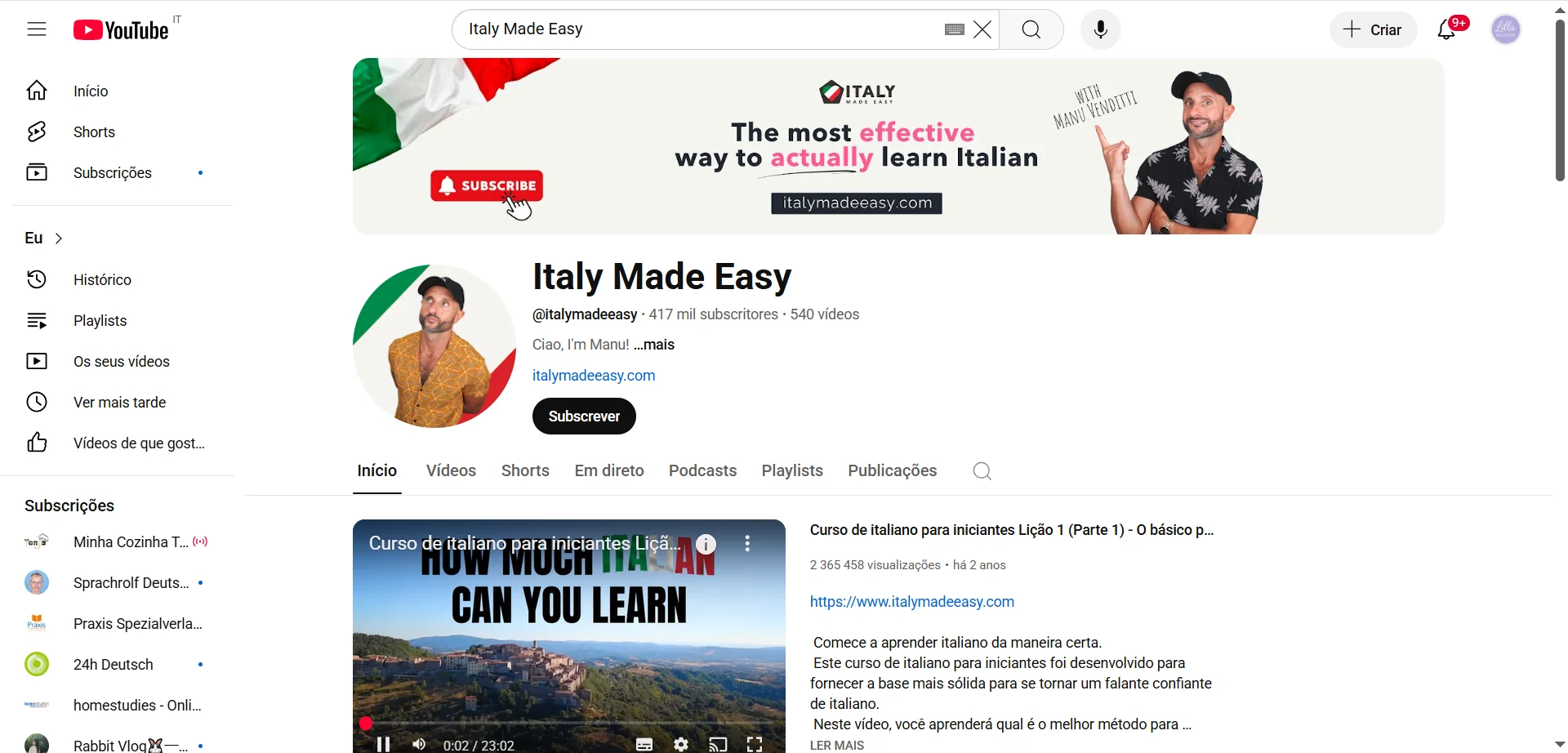 Perfeito para quem está começando a aprender italiano. Com uma abordagem simples e objetiva, Italy Made Easy tem como objetivo tornar o aprendizado do italiano fácil e acessível. A qualidade dos vídeos e a clareza nas explicações tornam o canal ideal para iniciantes que desejam construir uma base sólida.