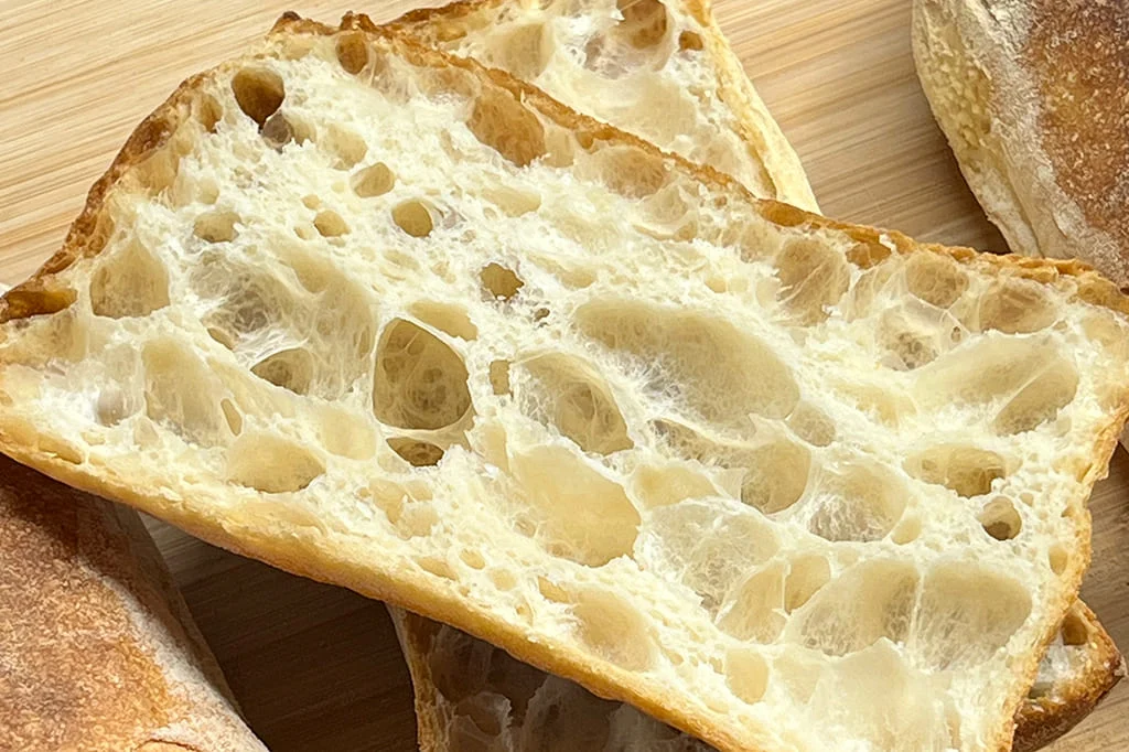 A ciabatta é um pão típico do norte da Itália, criado nos anos 1980 como uma alternativa italiana ao pão baguete. Com seu formato achatado, casca dourada e miolo bem arejado, ela conquistou o mundo e fica ainda melhor quando feita com levain.