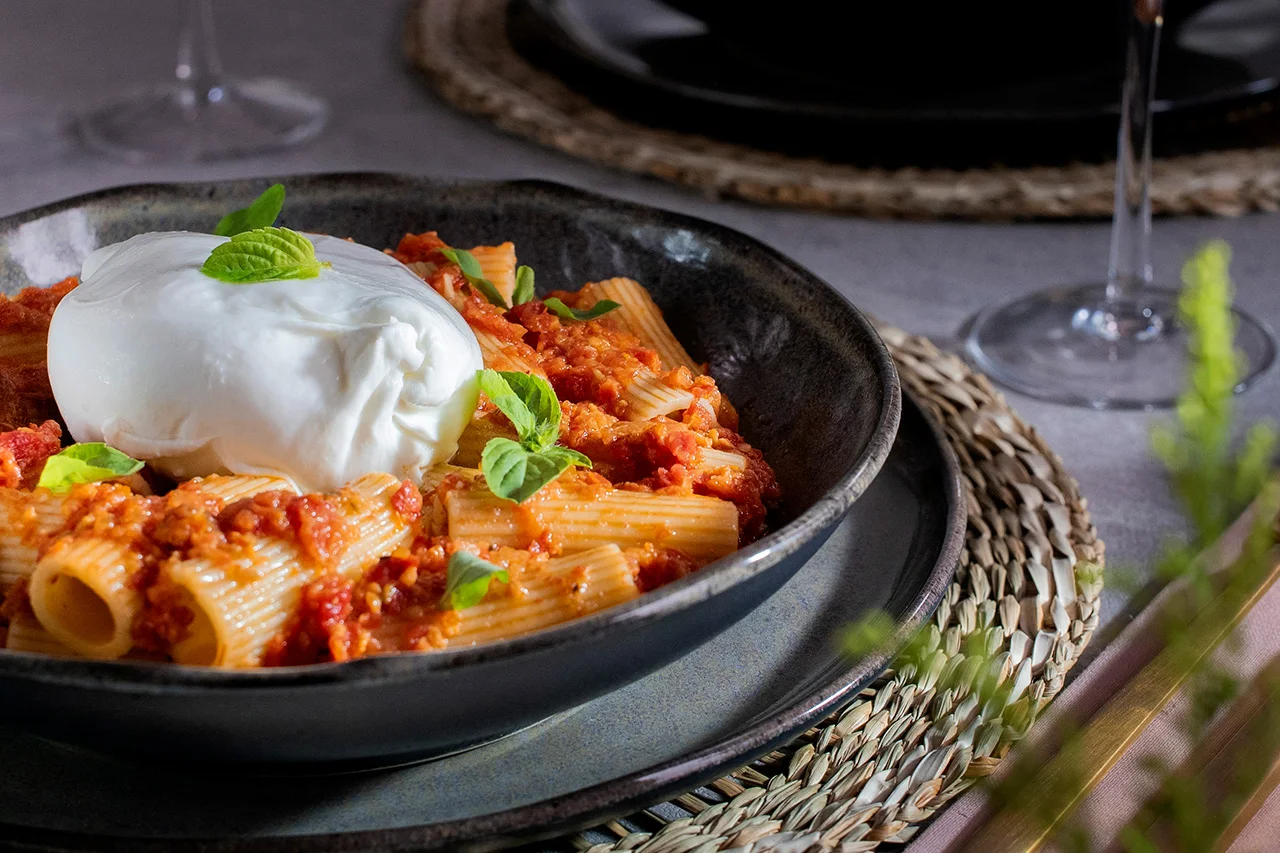 Macarrão com burrata é um primeiro prato mediterrâneo com um charme simples e direto. Para esta delícia culinária você pode usar o formato de massa que preferir, envolto em molho de tomate cereja fresco - de preferência cereja ou San Marzano robusto - e manjericão combinado com o interior cremoso da burrata, conhecida como stracciatella. Ideal para momentos em que o tempo é limitado mas a vontade de uma refeição deliciosa é intensa, esta massa com burrata proposta pela Tavola Arte Gusto conquista pela sua cremosidade e pelo seu aroma irresistível.