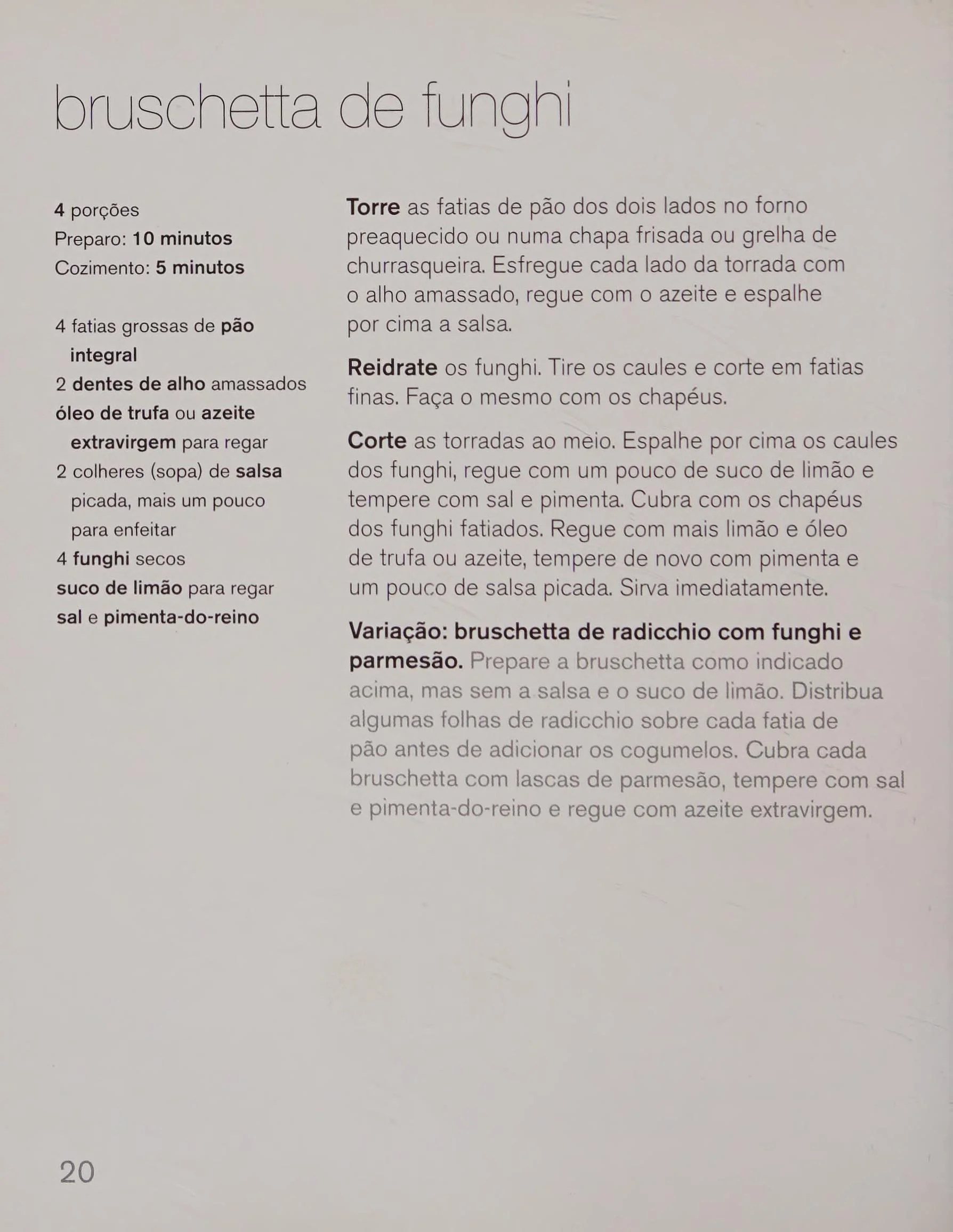 Bruschetta de radicchio com funghi e parmesão. Prepare a bruschetta como indicado acima, mas sem a salsa e o suco de limão. Distribua algumas folhas de radicchio sobre cada fatia de pão antes de adicionar os cogumelos. Cubra cada bruschetta com lascas de parmesão, tempere com sal e pimenta-do-reino e regue com azeite extravirgem.