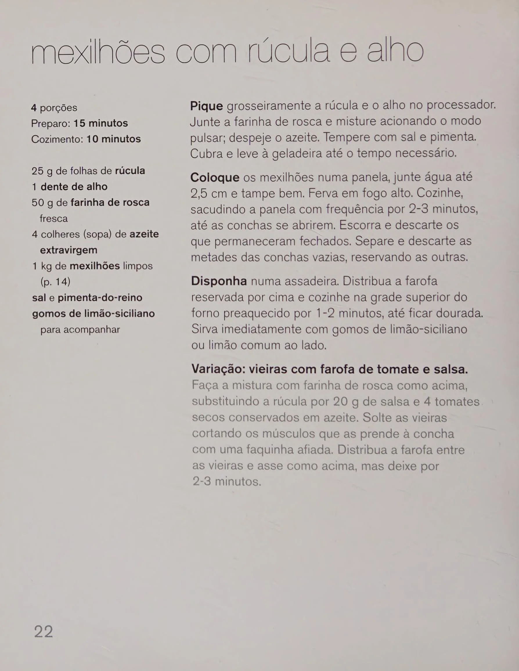 Vieiras com farofa de tomate e salsa. Faça a mistura com farinha de rosca como acima, substituindo a rúcula por 20 g de salsa e 4 tomates secos conservados em azeite. Solte as vieiras cortando os músculos que as prendem à concha com uma faquinha afiada. Distribua a farofa entre as vieiras e asse como acima, mas deixe por 2-3 minutos.