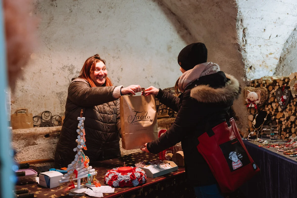 Passeie pelas ruas estreitas de Faedo e descubra as estações de artesãos locais que expõem suas criações, incluindo trabalhos em feltro, objetos de madeira, decorações natalinas e muito mais.