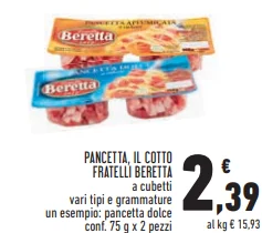 - PANCETTA, IL COTTO FRATELLI BERETTA a cubetti (conf. 75 g x 2 pezzi) - €2,39 (Bacon, IL COTTO FRATELLI BERETTA em cubos, pacote de 75 g x 2 peças)