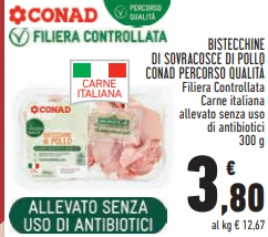 - BISTECCHINE DI SOVRACOSCE DI POLLO CONAD PERCORSO QUALITÀ Filiera 300 g - €3,80 (Bifinhos de Sobrecoxa de Frango CONAD Percorso Qualità, 300 g)