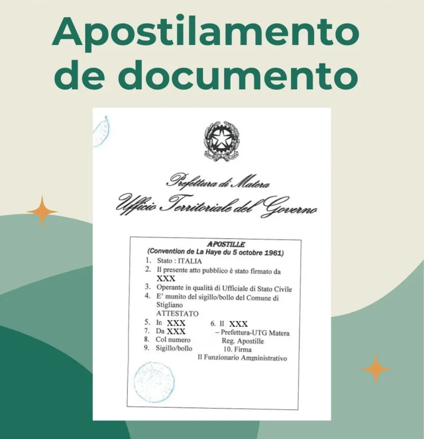 O apostilamento (Apostille) é realizado mediante agendamento no Tribunal. A validade dos documentos é determinada pela assinatura ou carimbo do funcionário público. Com a adição de uma assinatura ou carimbo, os documentos públicos italianos são válidos e aceitos inclusive em outros países.